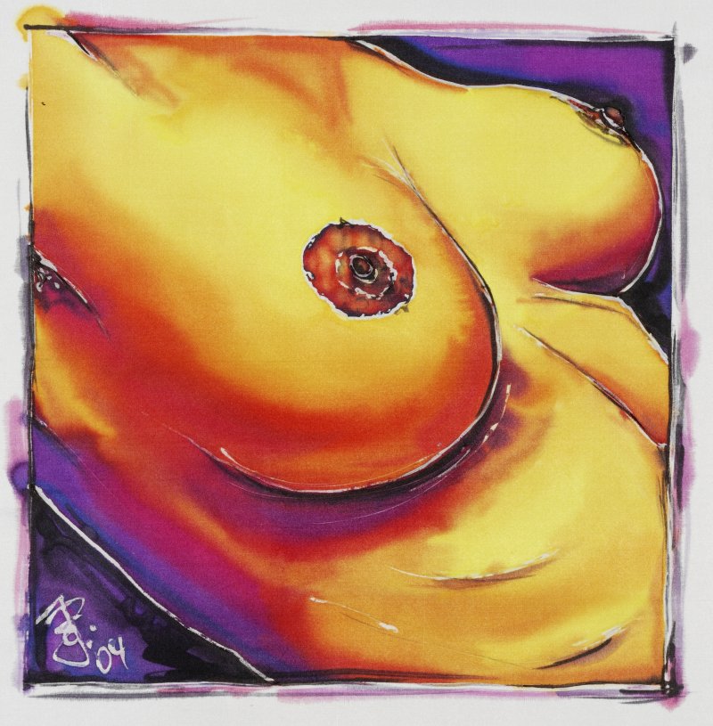 Emotional ausdrucksstarke Aktbilder auf reiner Seide, gemalt mich speziellen Seidenfarben. Diese gegenständliche Kunst wird in kräftigen harmonisch aufeinander abgestimmten Farben dargestellt.