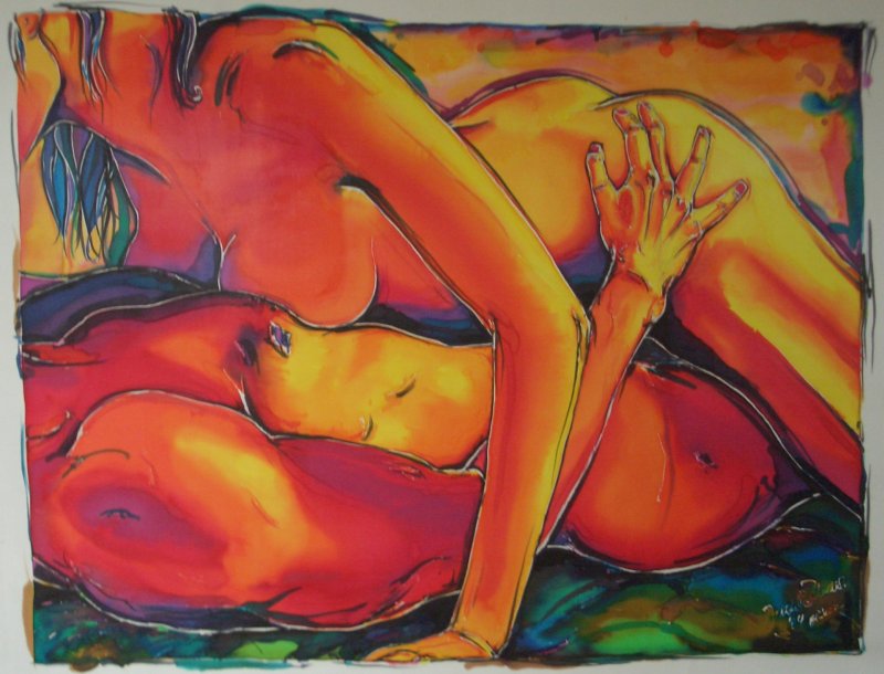 Emotional ausdrucksstarke Aktbilder auf reiner Seide, gemalt mich speziellen Seidenfarben. Diese gegenständliche Kunst wird in kräftigen harmonisch aufeinander abgestimmten Farben dargestellt.